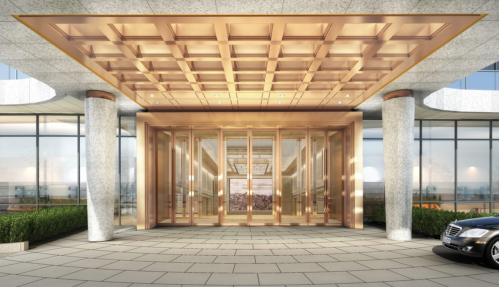 一層接待廳---接待廳延續(xù)迎賓大廳的設計風格,同時提煉水紋元素賦予空間,“上善若水”水善利萬物而不爭, 謙遜內(nèi)斂,銅制材質(zhì)與織物硬包、手工地毯結(jié)合溫潤空間,空間架構(gòu)利用柱檐營造“亭”之理念,取上合組織匯聚八方的美好寓意,以溫潤的暖色調(diào)烘托室內(nèi)空間氣氛,莊重、典雅是整個空間的設計原則。