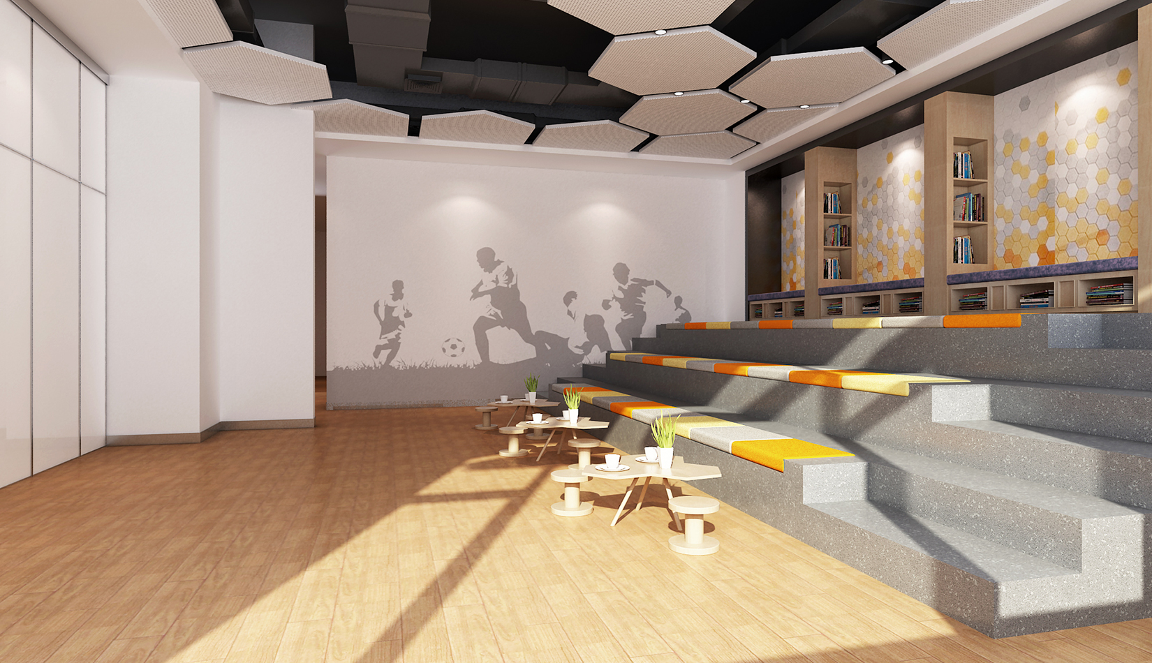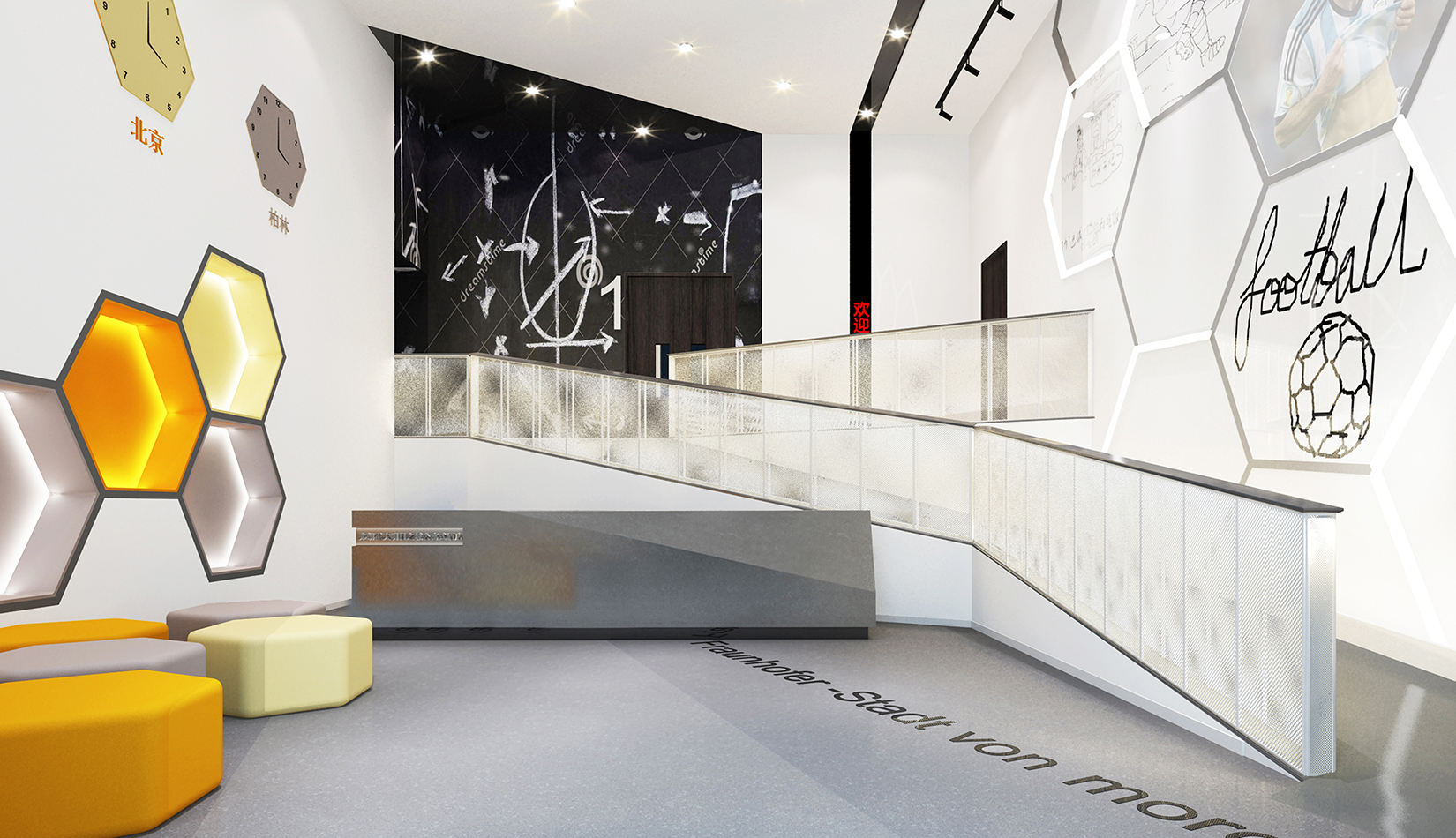 一層大廳提取足球六邊形元素作為墻面背景,在此設計人行坡道,方便人流同行,并能形成較好的形式感。