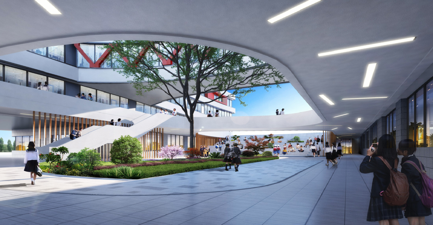 校園規(guī)劃采用曲線手法,營造流水姿態(tài),將東側(cè)山脈與西側(cè)河流連接在一起。設(shè)計(jì)現(xiàn)代化“山水”校園,使學(xué)生在自然中成長。營造活水發(fā)源的“源頭”意境,寓意教育為人類文化長河的源頭,呼應(yīng)學(xué)校“源頭”文化。曲線舒展的形體,整體采用白色色調(diào),局部以紅黃色進(jìn)行點(diǎn)綴,風(fēng)格純潔又不失活潑。