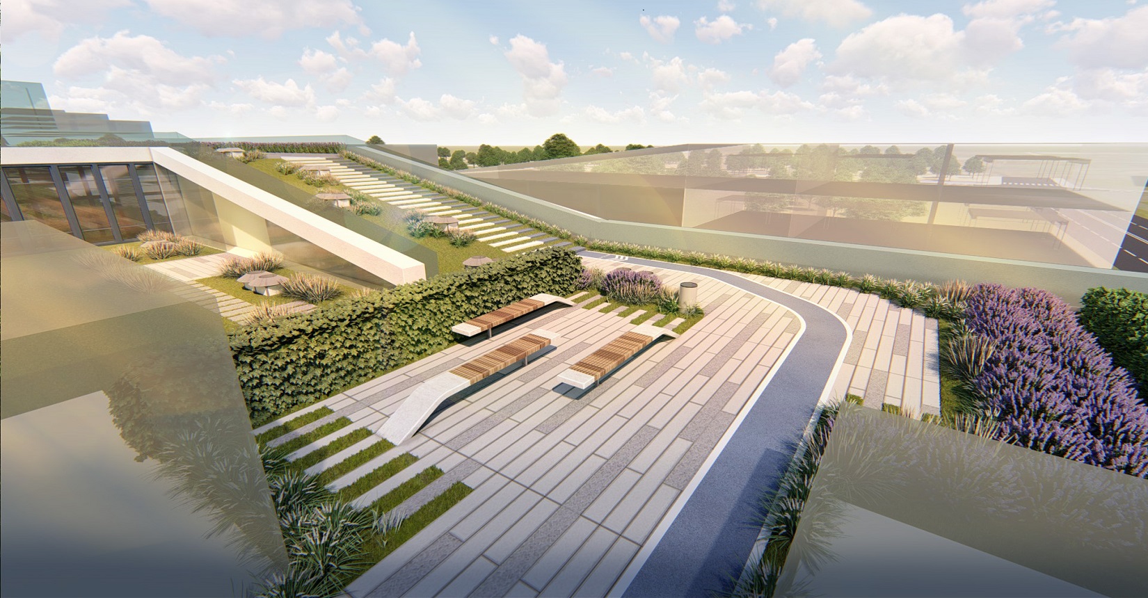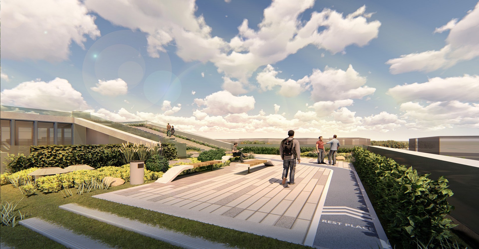 強調(diào)室內(nèi)空間和室外空間的融合,利用屋面打造慢行系統(tǒng),使建筑成為公園的組成部分,將公園景觀引入建筑當中,打造具有標志性的城市客廳、一個戶外生態(tài)客廳、原生態(tài)的生活空間,鼓勵面對面的交流,員工之間的交流,員工與客戶的交流,鄰里之間的交流。使用一條流動的能量線環(huán)形慢跑道,串聯(lián)整個空間傳達先進、高能量與流動的整體形象。